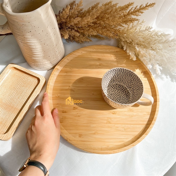 Khay được làm bằng gỗ tre tỉ mỉ, khay có thể dùng đựng hoa quả, bánh trái, nước uống sử dụng trong đời sống hằng ngày, dùng làm đồ vật trang trí, chụp ảnh sản phẩm đều tiện dụng và rất ăn ảnh.